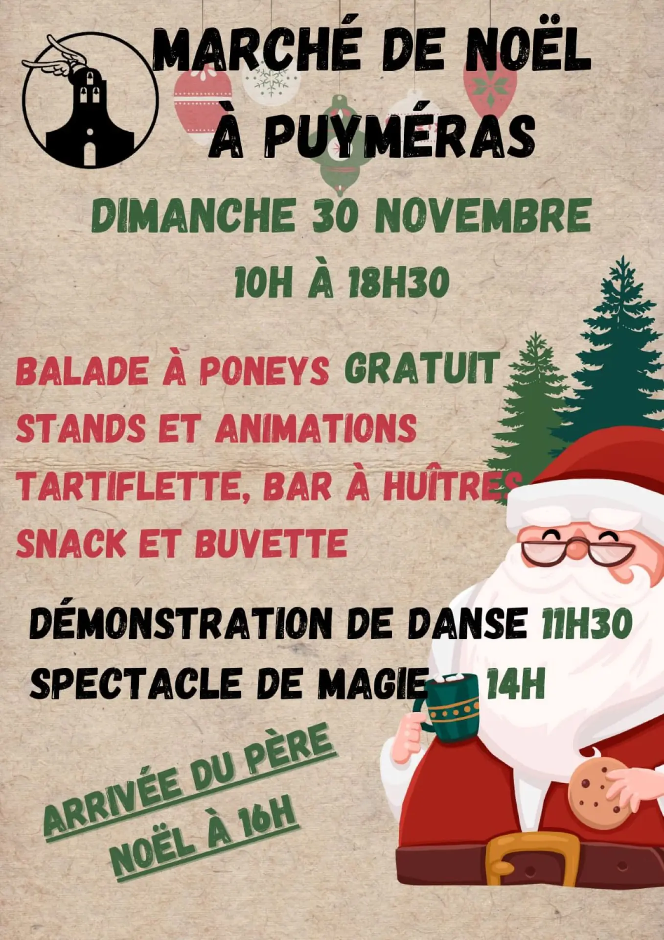 Puyméras organizes its Christmas market in a warm and festive atmosphere: pony rides, stalls and entertainment, dance demonstration at 11am and magic show at 2pm. Santa Claus arrives at 4pm.