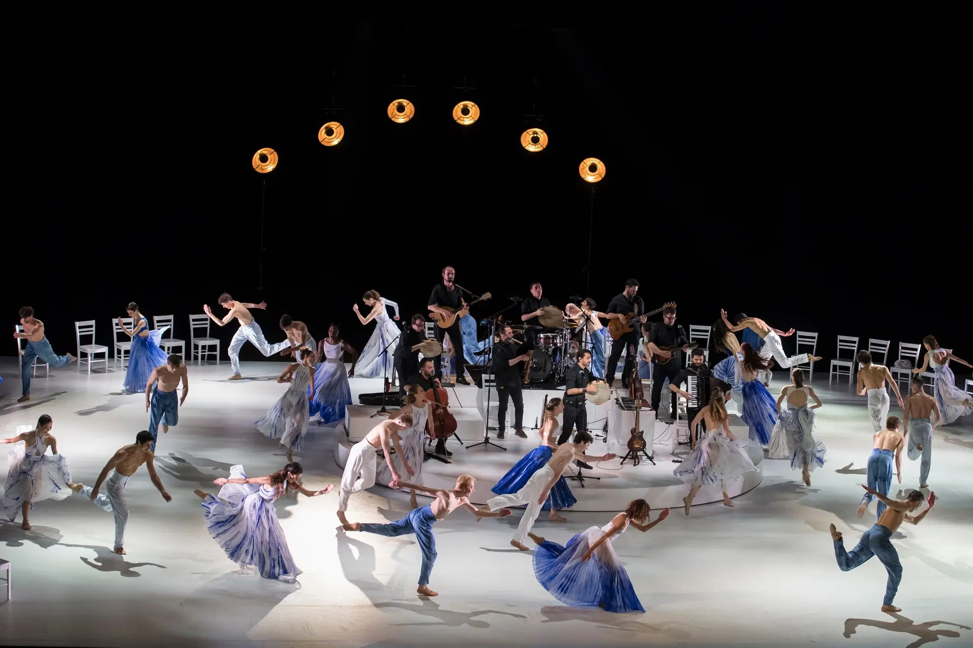 Once the ban had been circumvented, the villagers could devote themselves to this popular dance, which combines trance and seduction, to the point of exhaustion. Love, the desire that consumes bodies, and death, the outlines of which we can already make out... this is the furrow that Jean-Christophe Maillot has been digging for forty years. Here again, his choreography alternates moments of soothing sensuality with sequences of pure physical debauchery. Rising in intensity throughout the show, "Core Meu" ("My Heart") celebrates the intoxication of dance and delivers a Dionysian finale, at the end of which the fifty dancers collapse as one body.