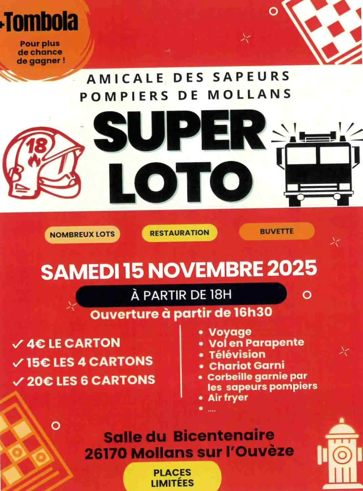 Super lotto organized by the firefighters' association. Numerous prizes to be won: trip, paragliding flight, television, cart, air flyer...