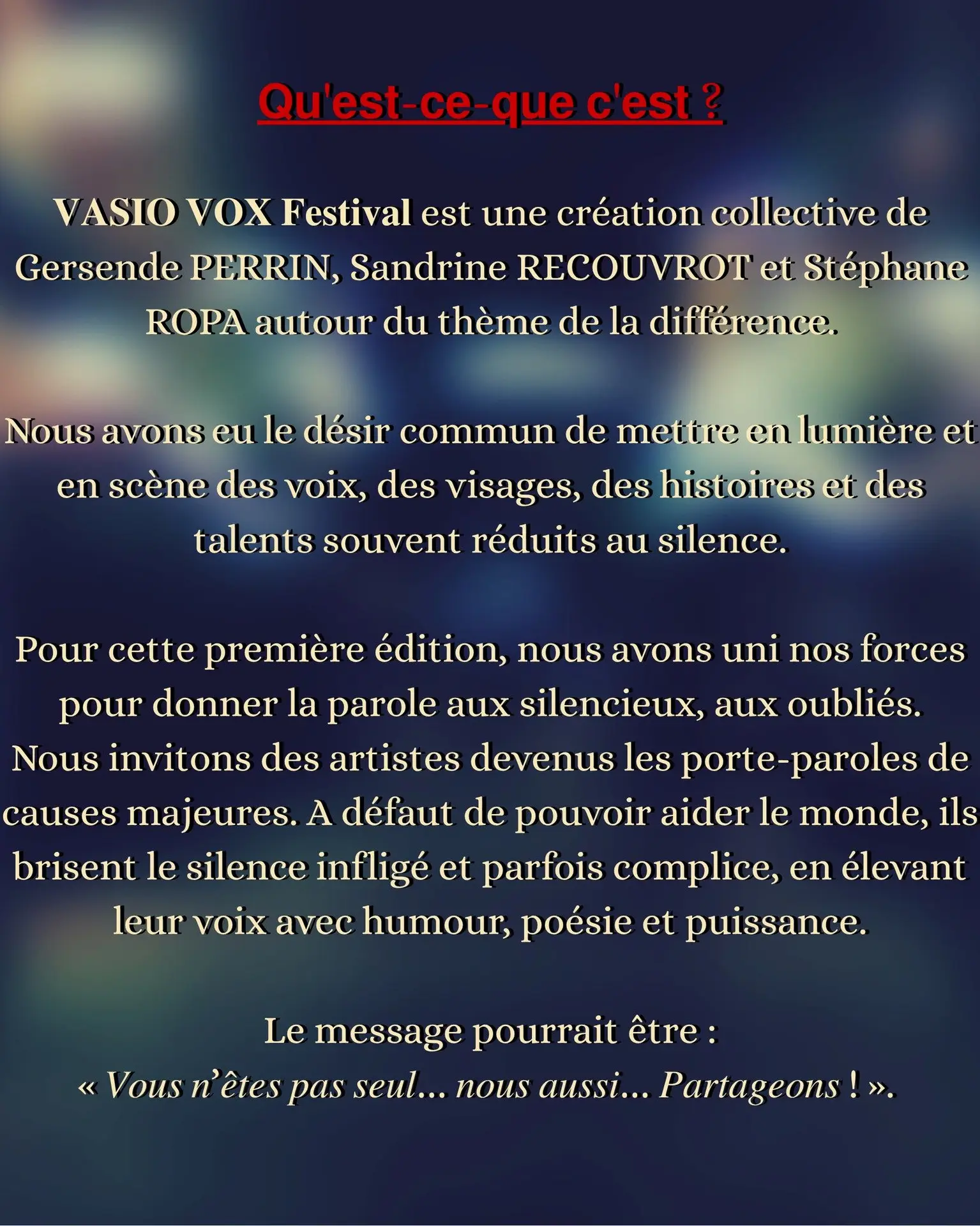 For this first edition, we are inviting artists who have become spokespersons for major causes. Although they can't help the world, they break the silence that is inflicted and sometimes complicit, by raising their voices sometimes with humor, sometimes with poetry, sometimes with power. The message could be: "You're not alone... we're not alone... let's share!