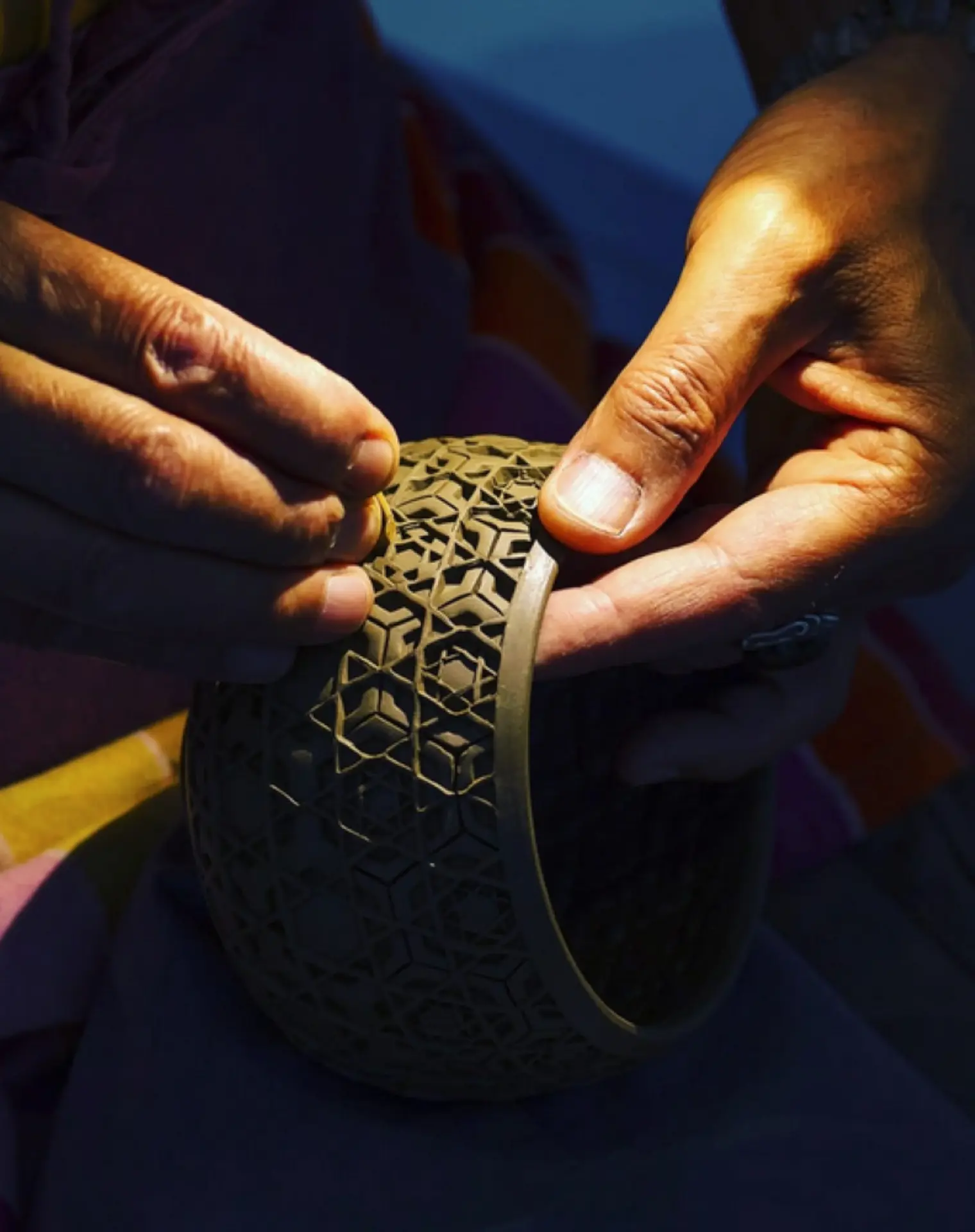 Other motifs not covered by the trainees will be demonstrated. The four bowls will present multiple relief readings of the non-embossed areas. At the end of the course, participants can keep their own work, and the host workshop will offer the first firing (cookie) included in the course.